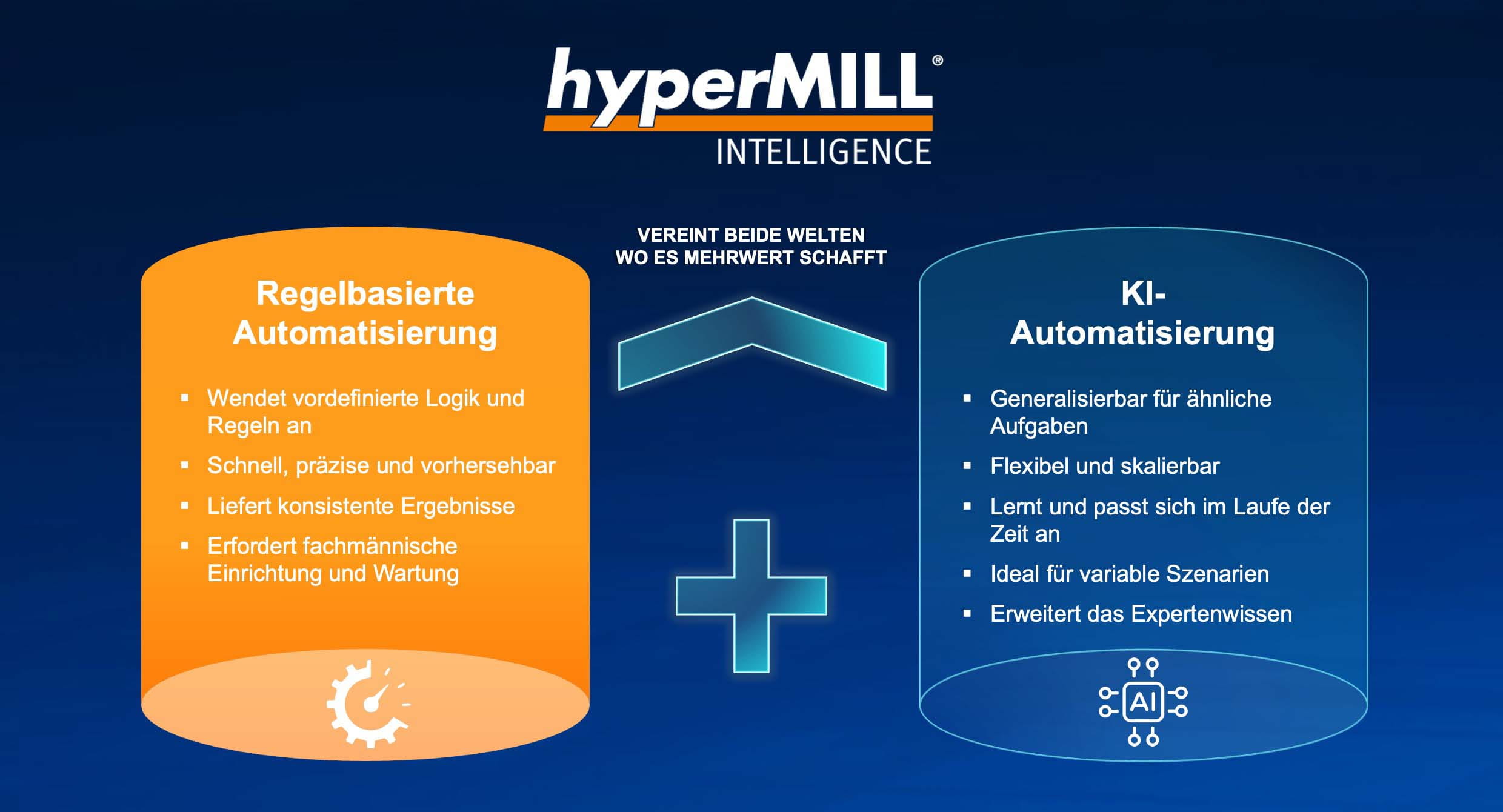 In der Fertigung erfordern Präzision und Zuverlässigkeit häufig regelbasierte Automatisierung, bei der bewährte Logik und unternehmensspezifisches Wissen konsistente, transparente Ergebnisse liefern. AI schafft Mehrwert, wenn Flexibilität und Mustererkennung gefragt sind. Mit hyperMILL INTELLIGENCE vereinen sich beide Welten: regelbasierte Steuerung, wo Genauigkeit zählt, und Unterstützung durch künstliche Intelligenz, wo sie die Kundenprozesse wirklich verbessert.