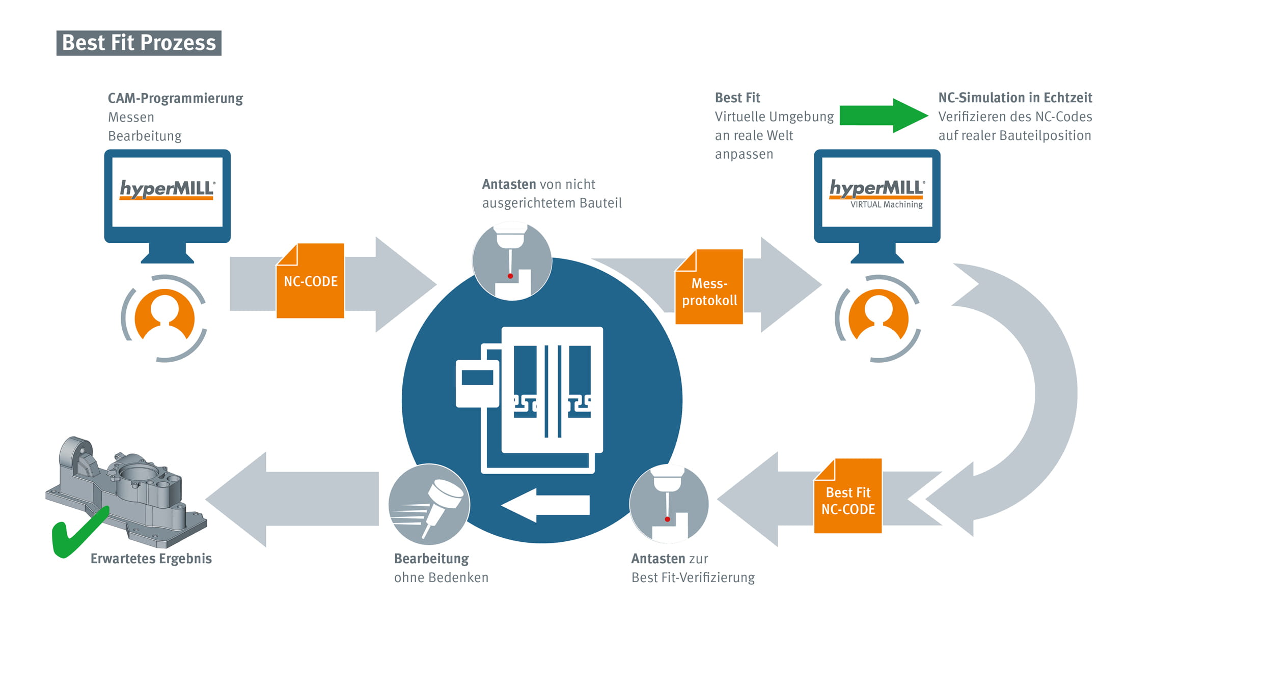 Abgesehen vom Sonderfall hybrider Maschinen, auf denen additive und subtraktive Fertigung direkt nacheinander erfolgen, verlangt die Nachbearbeitung die Ausrichtung eines Rohteils mit geringem Aufmaß in der Werkzeugmaschine. In der virtuellen Maschine von hyperMILL hat OPEN MIND mit der Funktion BEST FIT eine innovative Alternative zur manuellen Ausrichtung von Werkstücken für die Weiterbearbeitung bereitgestellt. Voraussetzung ist ein 5-Achs-Fräszentrum mit digitalem Messtaster. Das nicht ausgerichtete Rohteil wird auf der Maschine mit einer 3D-Messung angetastet und das Messprotokoll an das CAM-System gesendet. Die Software passt den NC-Code an die reale Bauteilposition an. So wird jetzt die virtuelle Welt der Programmierung an die reale Welt der Aufspannung angepasst.