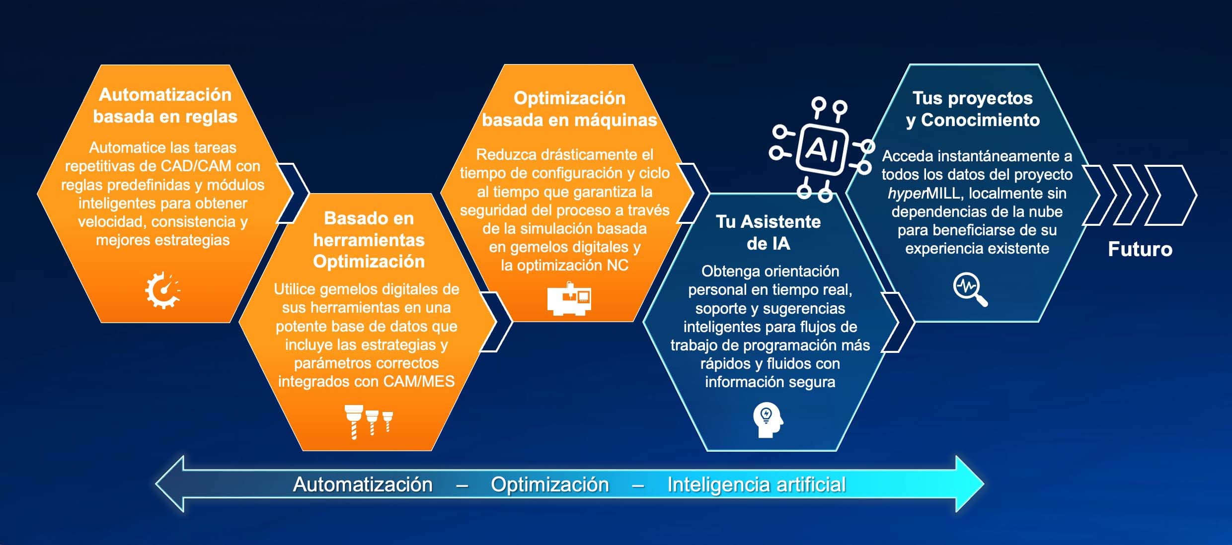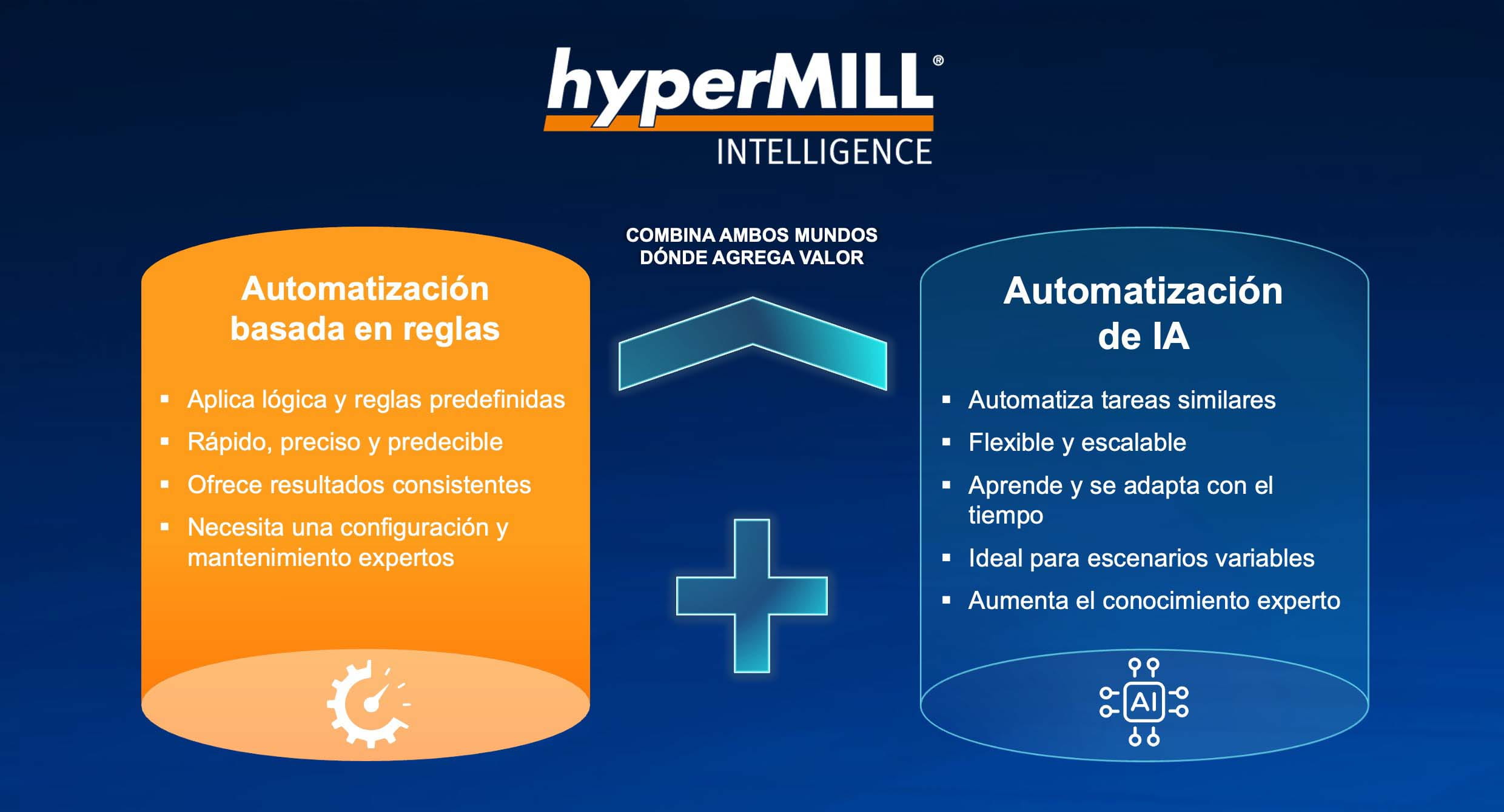 hyperMILL INTELLIGENCE es nuestro enfoque unificado para la fabricación inteligente. Este marco tecnológico integrado combina automatización basada en reglas, optimización de máquinas y herramientas y IA dirigida en un entorno coherente. Nuestra visión es usar lógica probada e inteligencia adaptativa para ofrecer precisión, fiabilidad y flexibilidad justo donde generan mayor impacto.