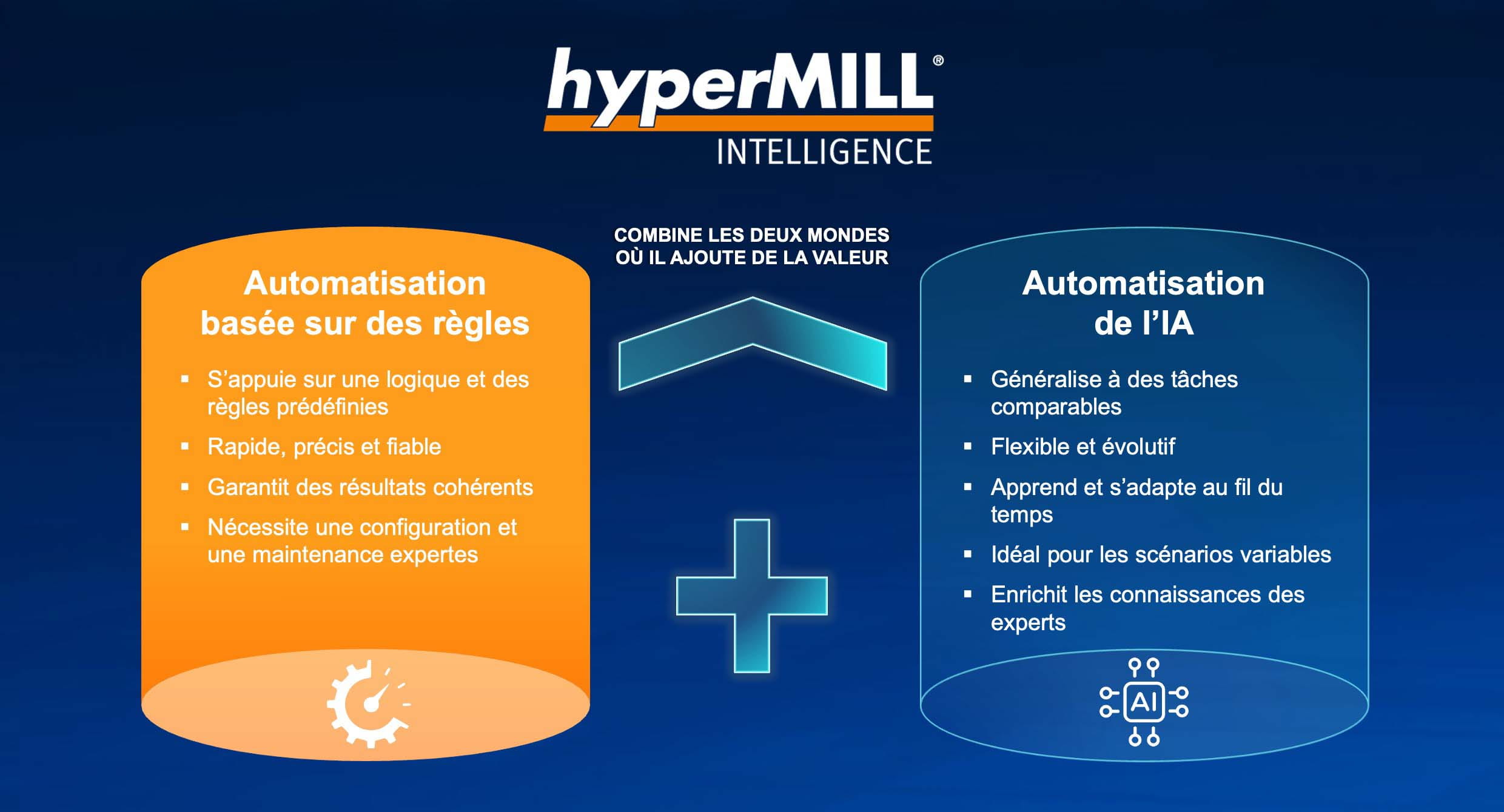 En production, la précision et la fiabilité exigent souvent une automatisation basée sur des règles, où une logique éprouvée et le savoir propre à l’entreprise offrent des résultats cohérents et transparents. L'IA apporte de la valeur quand flexibilité et reconnaissance des motifs sont nécessaires. Avec hyperMILL INTELLIGENCE, ces deux mondes se rejoignent : pilotage basé sur des règles lorsque la précision est essentielle, et appui de l’intelligence artificielle là où elle améliore réellement les processus de nos clients.