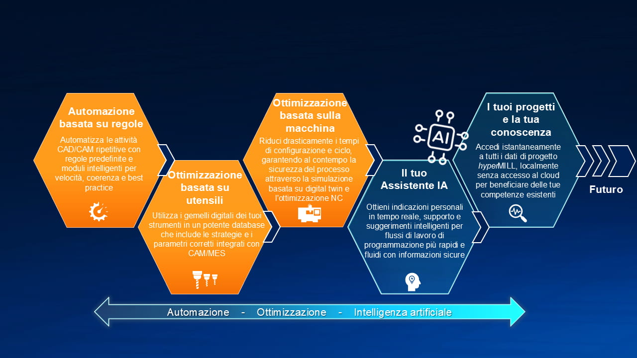 Nel mondo CAD/CAM l’IA genera valore solo quando è integrata in modo coerente nei processi. hyperMILL INTELLIGENCE unisce automazione, ottimizzazione e intelligenza artificiale in un’unica piattaforma tecnologica, progettata per garantire affidabilità operativa e intelligenza reale nella programmazione CAM.