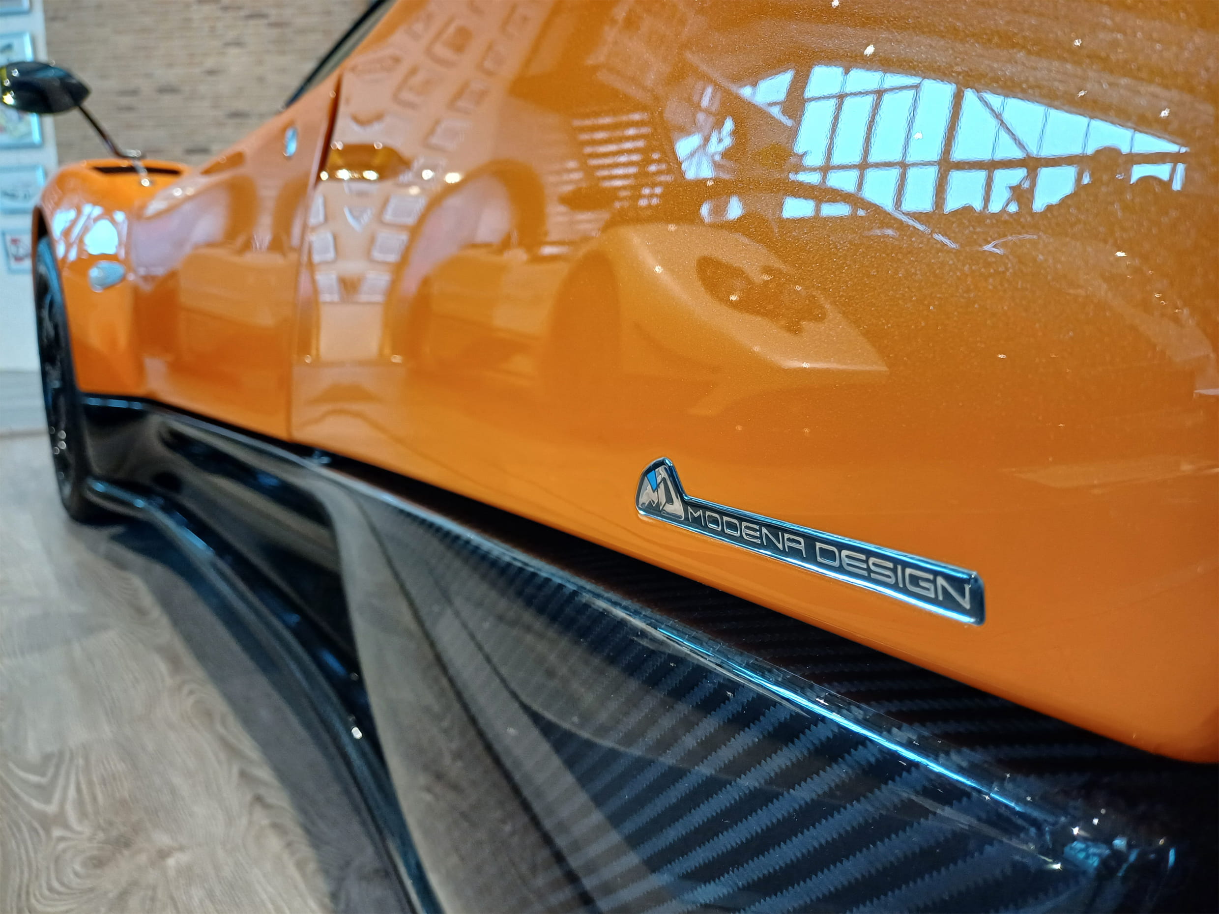 Il progetto ha richiesto più di quattromila disegni stilistici, dieci modelli in scala, un modello per la galleria del vento, due modelli in scala 1:1 e innumerevoli idee, ricerche e sperimentazioni su otto prototipi completi per un lavoro di team durato più di sei anni. Quest’ultimo modello, al pari di tutte le vetture realizzate da Pagani Automobili, è contraddistinto da un’elevata possibilità di personalizzazione in base alle richieste del cliente, al punto che è praticamente impossibile trovare due modelli perfettamente identici usciti dallo stabilimento modenese. Alta customizzazione, materiali e ricerca tecnologica sono le sfide che Modena Design, specializzata nelle lavorazioni di precisione, affronta quotidianamente insieme a Pagani Automobili in qualità di suo fornitore.