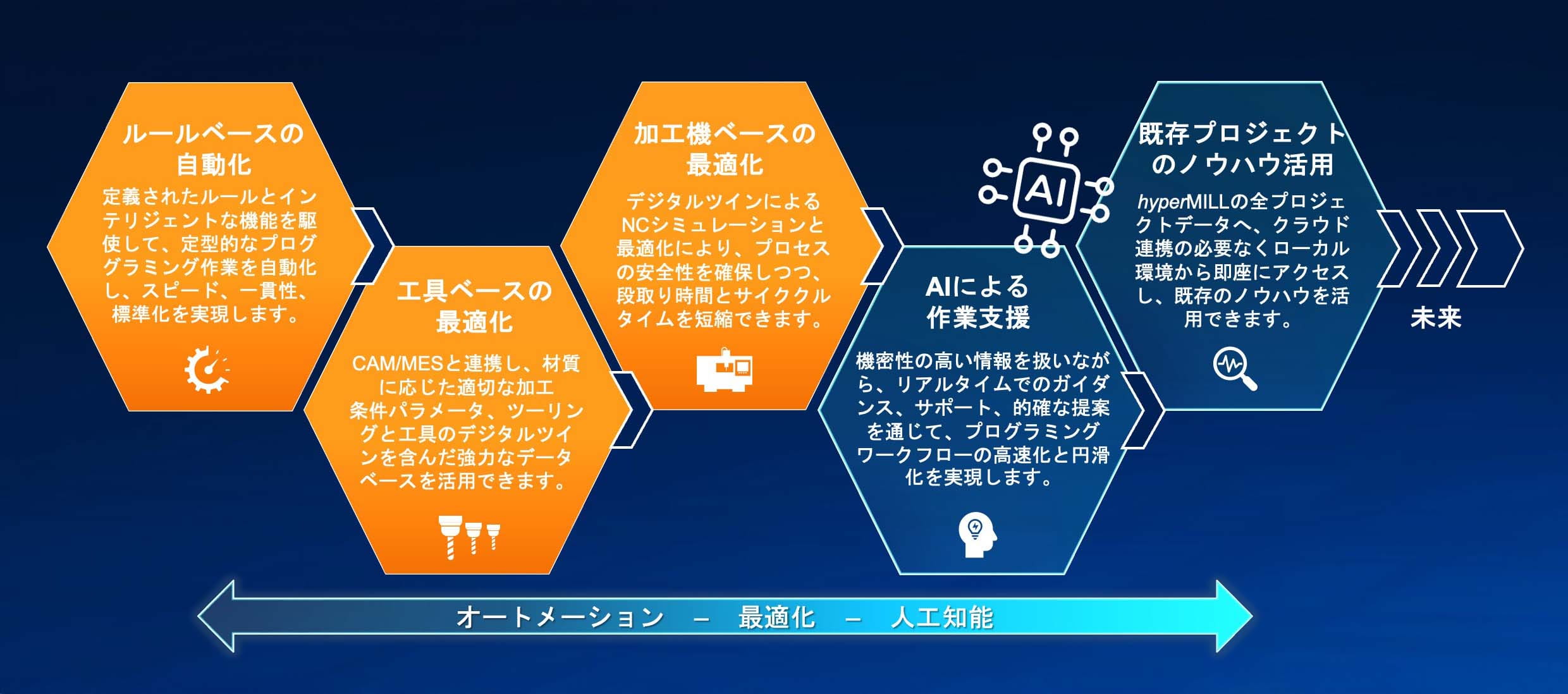 hyperMILL INTELLIGENCE は、スマート・マニュファクチャリングを実現するための、当社独自のアプローチです。この統合テクノロジーフレームワークは、ルールベースの自動化、機械と工具の最適化、そして対象を絞ったAIを、一貫性のある単一の環境内で組み合わせます。 私たちのビジョンは、実績あるロジックと適応性の高いインテリジェンスの両方を活用することで、精度、信頼性、そして柔軟性を、最も大きな効果を発揮する箇所で確実に提供することです。