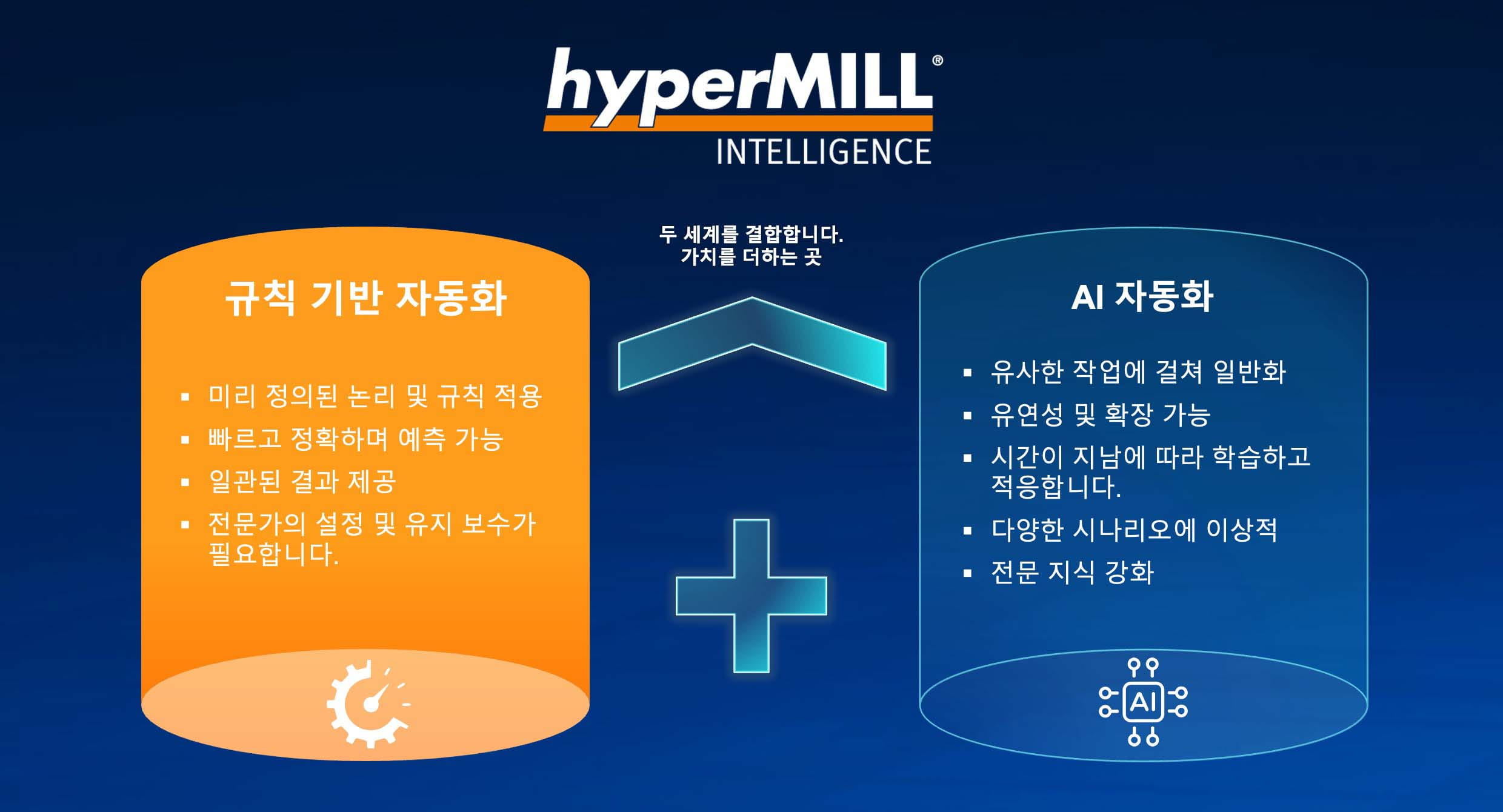제조에서는 정밀성과 신뢰성을 위해 종종 규칙 기반 자동화가 필요합니다. 검증된 로직과 기업 고유 지식이 일관되고 투명한 결과를 보장합니다. 유연성과 패턴 인식이 요구될 때 AI가 가치를 더합니다. hyperMILL INTELLIGENCE로 두 세계가 결합됩니다: 정확도가 중요한 곳엔 규칙 기반 제어, 실질적 향상이 가능한 곳엔 인공지능 지원.