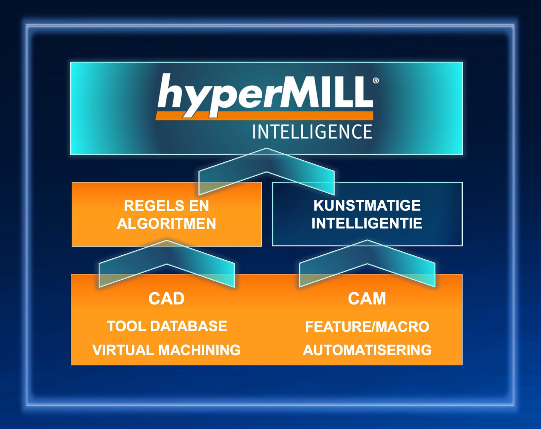hyperMILL INTELLIGENCE is onze uniforme benaderingvan intelligente productie. Dit geïntegreerde technologische framework combineert op regels gebaseerde automatisering, machine- en gereedschapsoptimalisatie en gerichte AI binnen één consistente omgeving. Onze visie is om zowel bewezen logica en adaptieve intelligentie te gebruiken om precisie, betrouwbaarheid en flexibiliteit te leveren, precies daar waar ze de grootste impact hebben.
