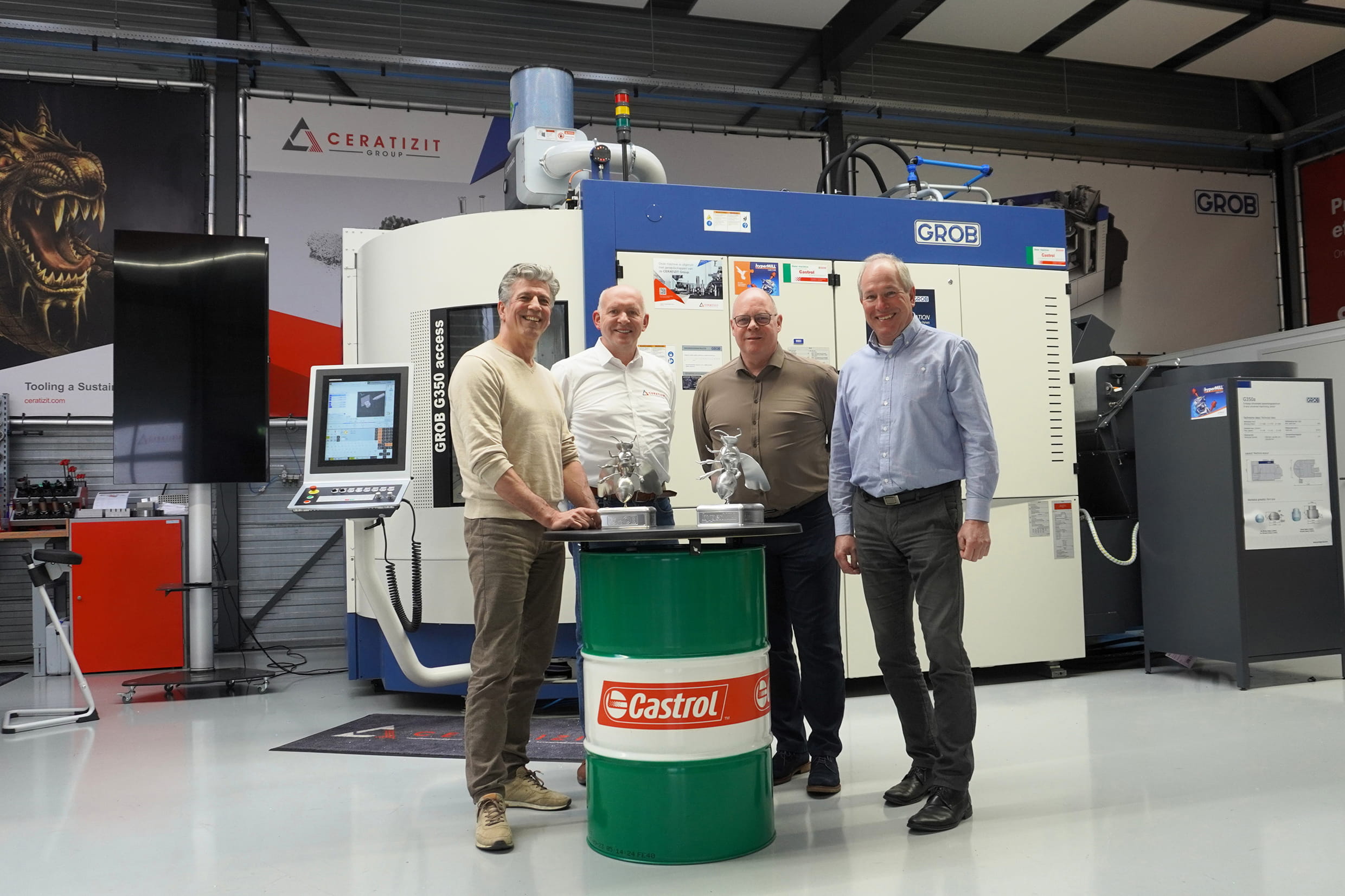 Ook de GROB G350-machine zelf werd uitgerust met hoogwaardige smeermiddelen van Castrol, die bijdragen aan een stabiel en betrouwbaar productieproces. De toepassing van Castrol MAGNA SW D 68 lijnbaanolie zorgt voor optimale geleiding en bescherming tegen slijtage, terwijl de Castrol Hyspin AWH-M 46 hydraulische olie garant staat voor een stabiele werking van het hydraulisch systeem, zelfs onder hoge belasting en temperatuur.