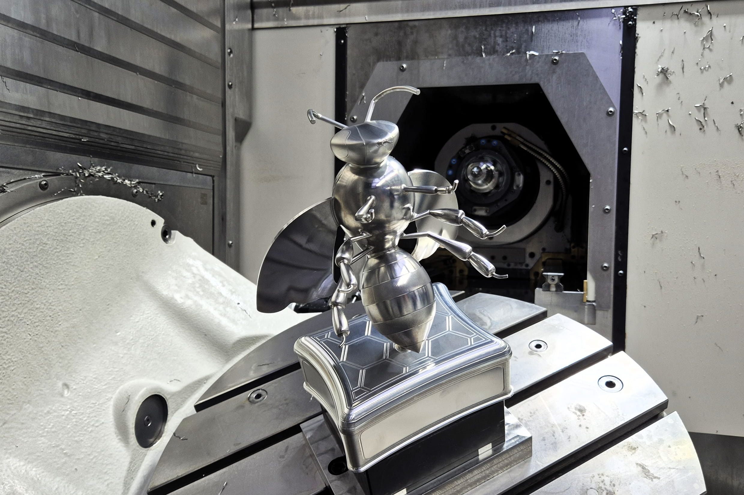 De productie van de honingbij vergde ongeveer 72 uur bewerkingstijd. Het oorspronkelijke blok aluminium woog 32 kg; het eindresultaat slechts 6 kg. De verhouding zegt alles over de nauwkeurigheid waarmee er gewerkt is. De fijnste details, zoals poten en voelsprieten, van slechts 3 tot 5 mm diameter, vroegen om speciale bewerkingsstrategieën, opspanningen en gereedschapskeuzes.