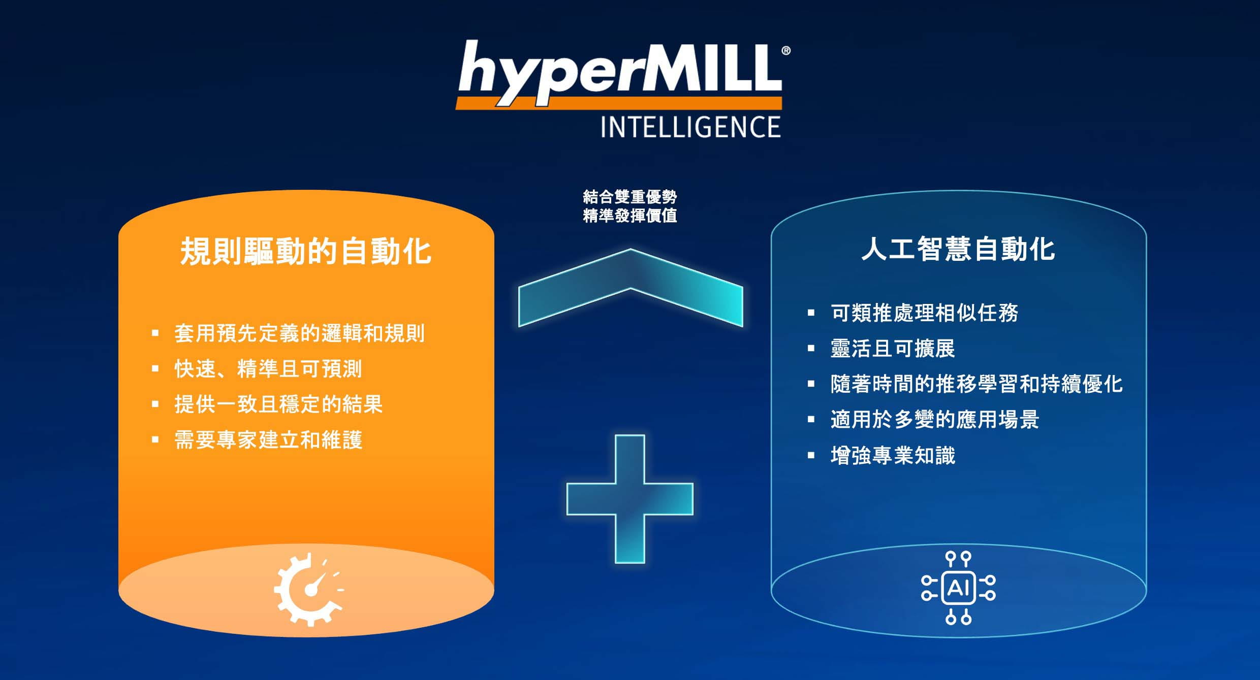 在製造領域,為確保精度與可靠性,往往需要以規則驅動的自動化;並藉由驗證過的邏輯與企業專有知識,達成一致且透明的結果。當需要靈活與圖形辨識時,AI 則能發揮其加值作用。 hyperMILL INTELLIGENCE 結合兩者優勢:在精度為重的情境中採用規則控制,在需要彈性與辨識能力的環節中輔以人工智慧,真正優化客戶的製造流程。