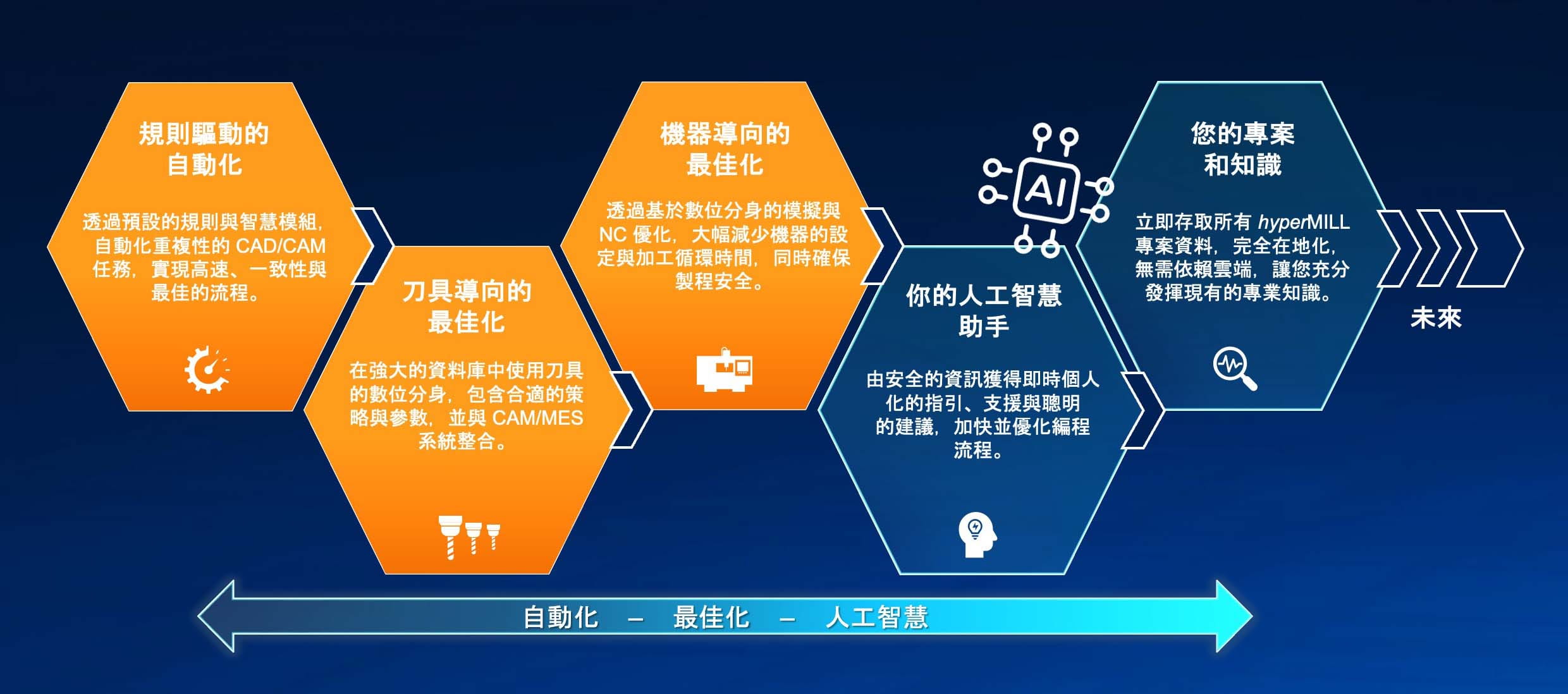hyperMILL INTELLIGENCE 的每個領域,都是對現代製造真實挑戰的精準回應:無論是重複的編程、切削的工具最佳運用、加工效率瓶頸或是與專業經驗傳承的斷層。我們的策略很明確:針對每一項任務採用最合適的技術,將以規則為基礎的邏輯、智慧自動化與針對的 AI 整合至同一套系統中,讓製造流程中的每一個步驟都更快速、更穩定、更易複製。